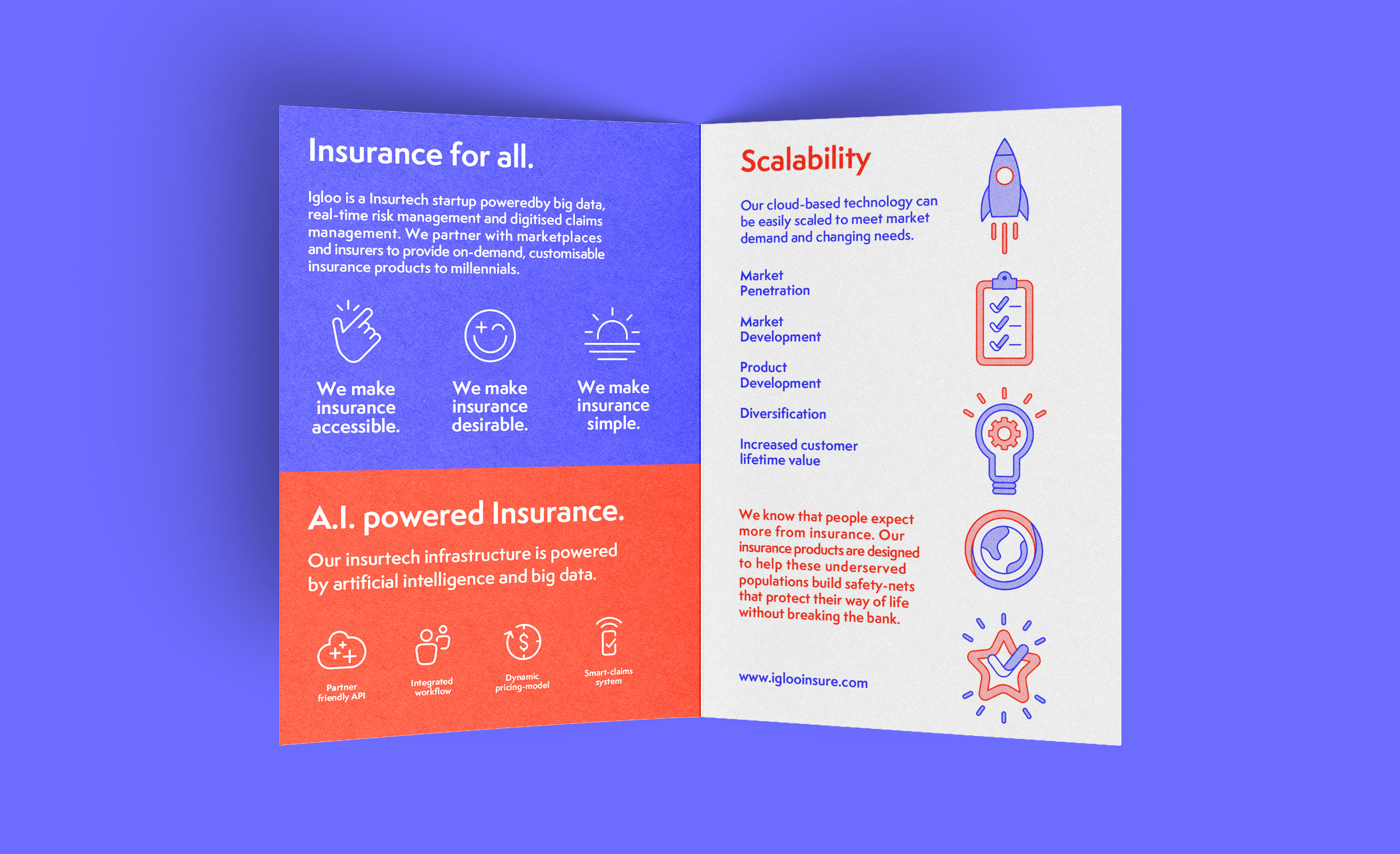 We created a vibrant and engaging brand to excite a large South East Asian audience. The blue colour symbolises the brand's calm and level-headed attitude, whereas the orange represents the warm, protective environment (that of inside an igloo), positivity and ease of use.