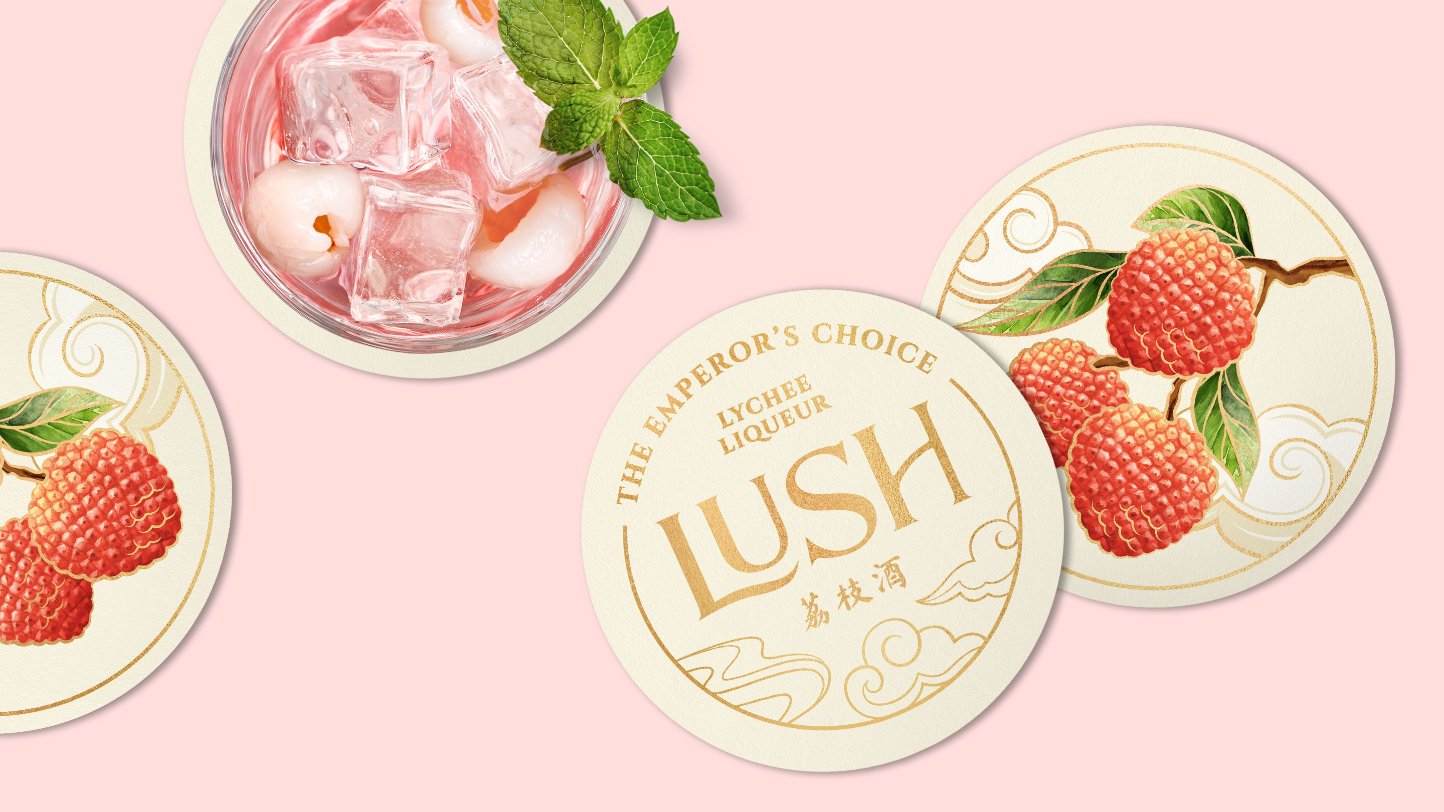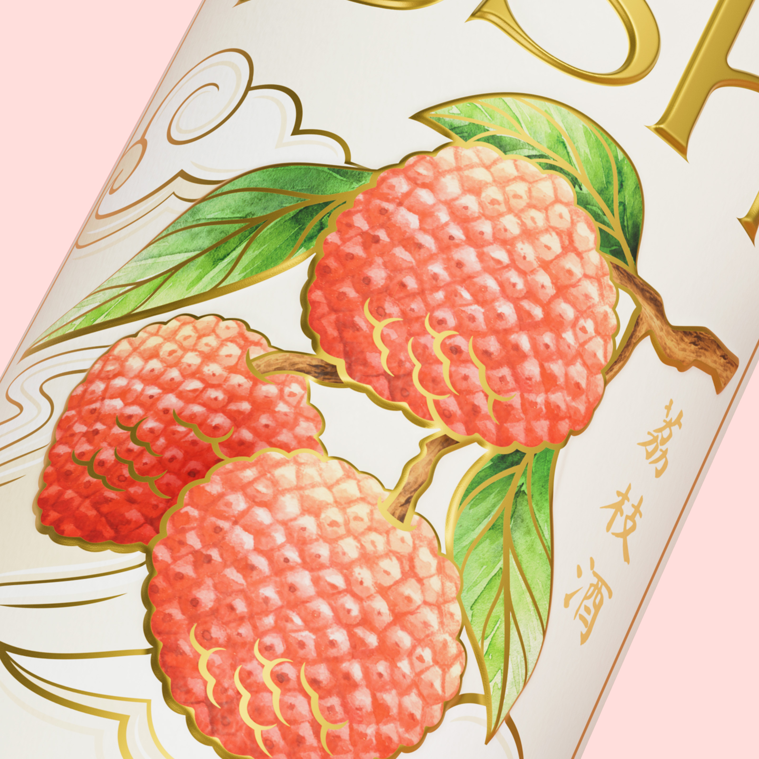 The design draws from Chinese imperial motifs and traditional fruit illustrations, reimagined with a contemporary edge. A warm palette and gilded accents capture the richness of lychee. From packaging to brand applications, Lush projects an inviting sense of wonder — premium yet playful, culturally rooted yet globally ready.