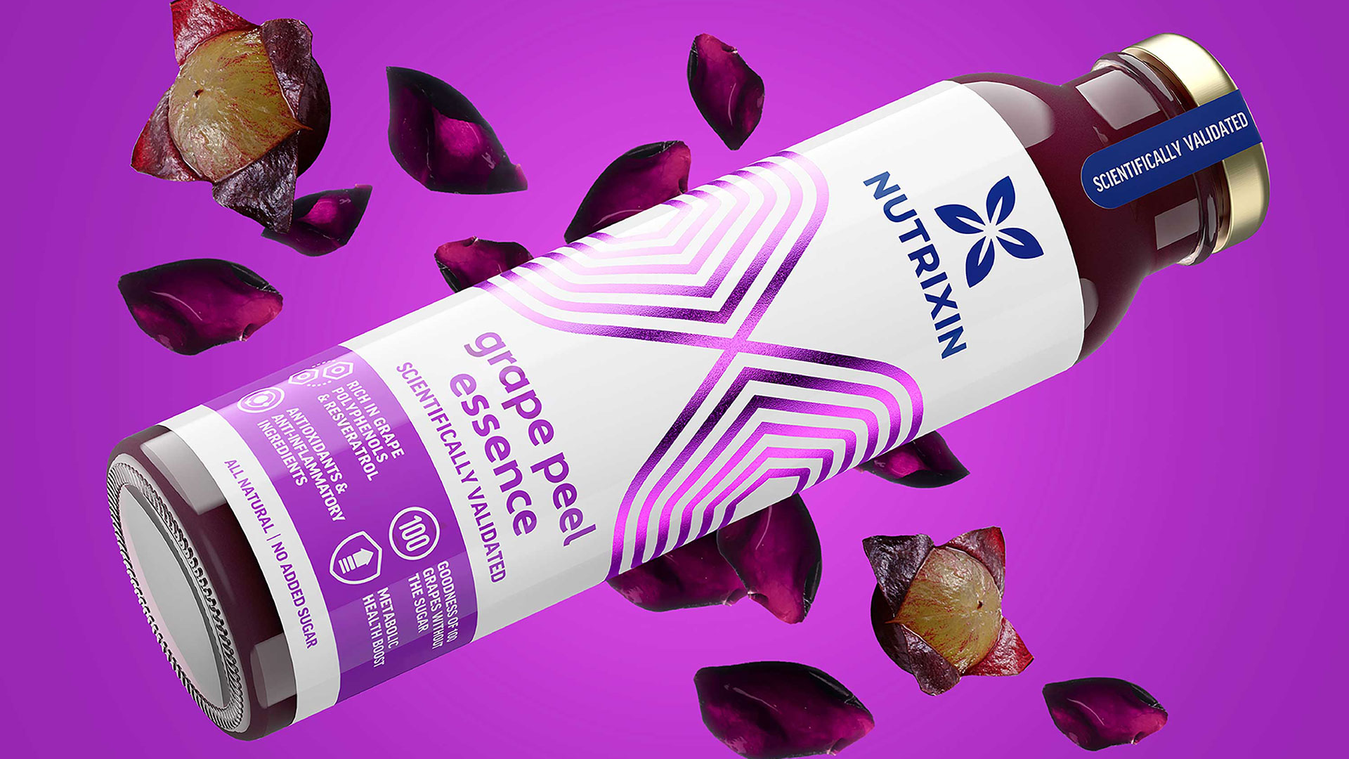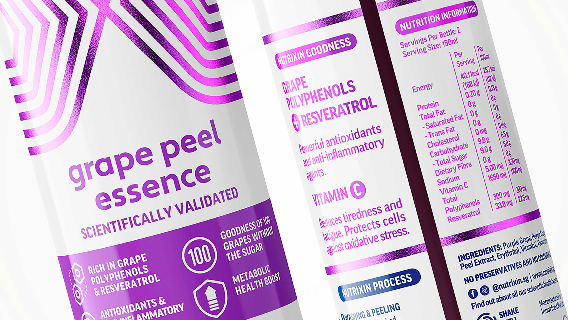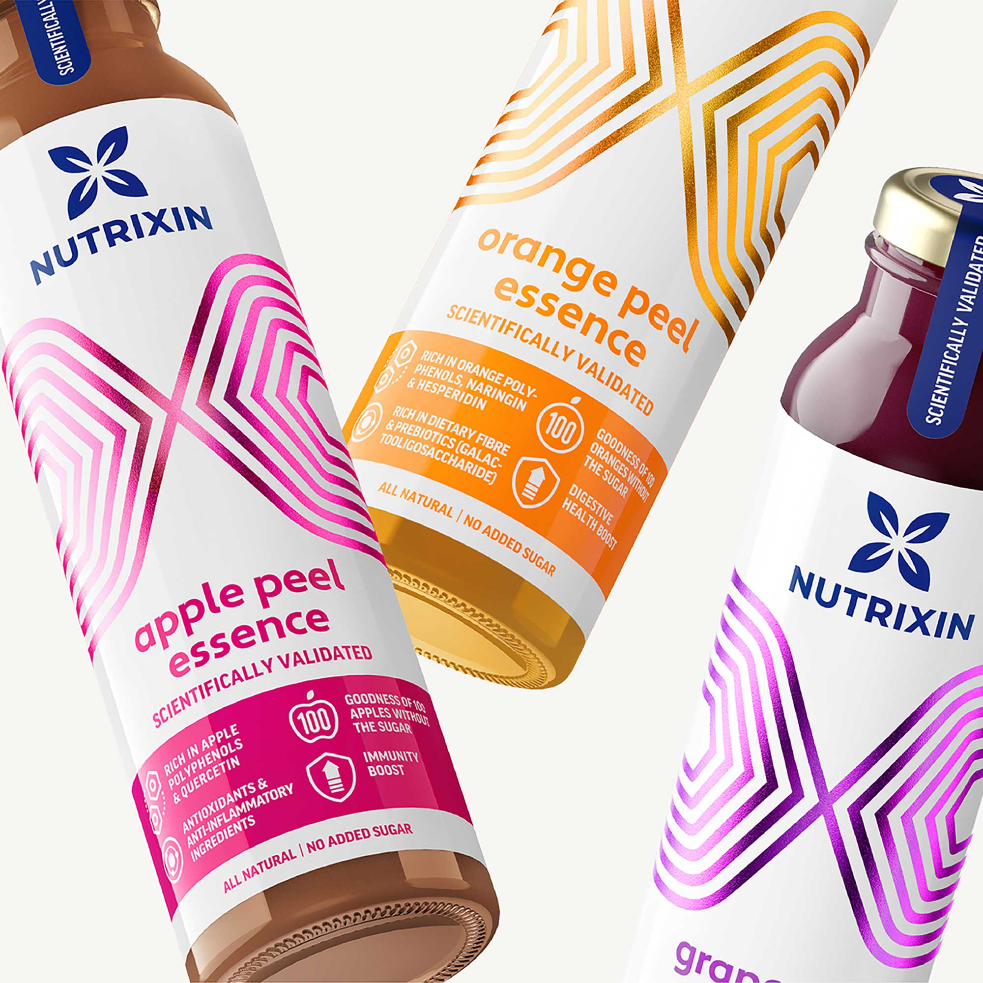 Nutrixin Peel Essence is a range of powerful antioxidants and anti-inflammatory beverages. Our brief was to create a brand and packaging design to reflect a strong vitamin benefit, while at the same time project a modern and contemporary lifestyle visual look. Science can be intimidating, so creating a simplified identity and introducing bold graphics and clear benefits gave the brand and packaging a compelling look without looking dry or overly medical.