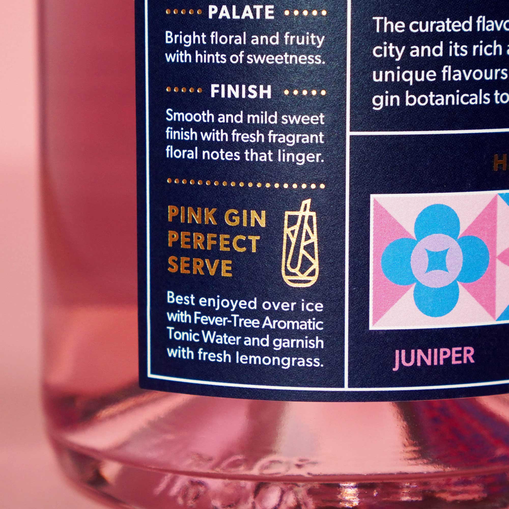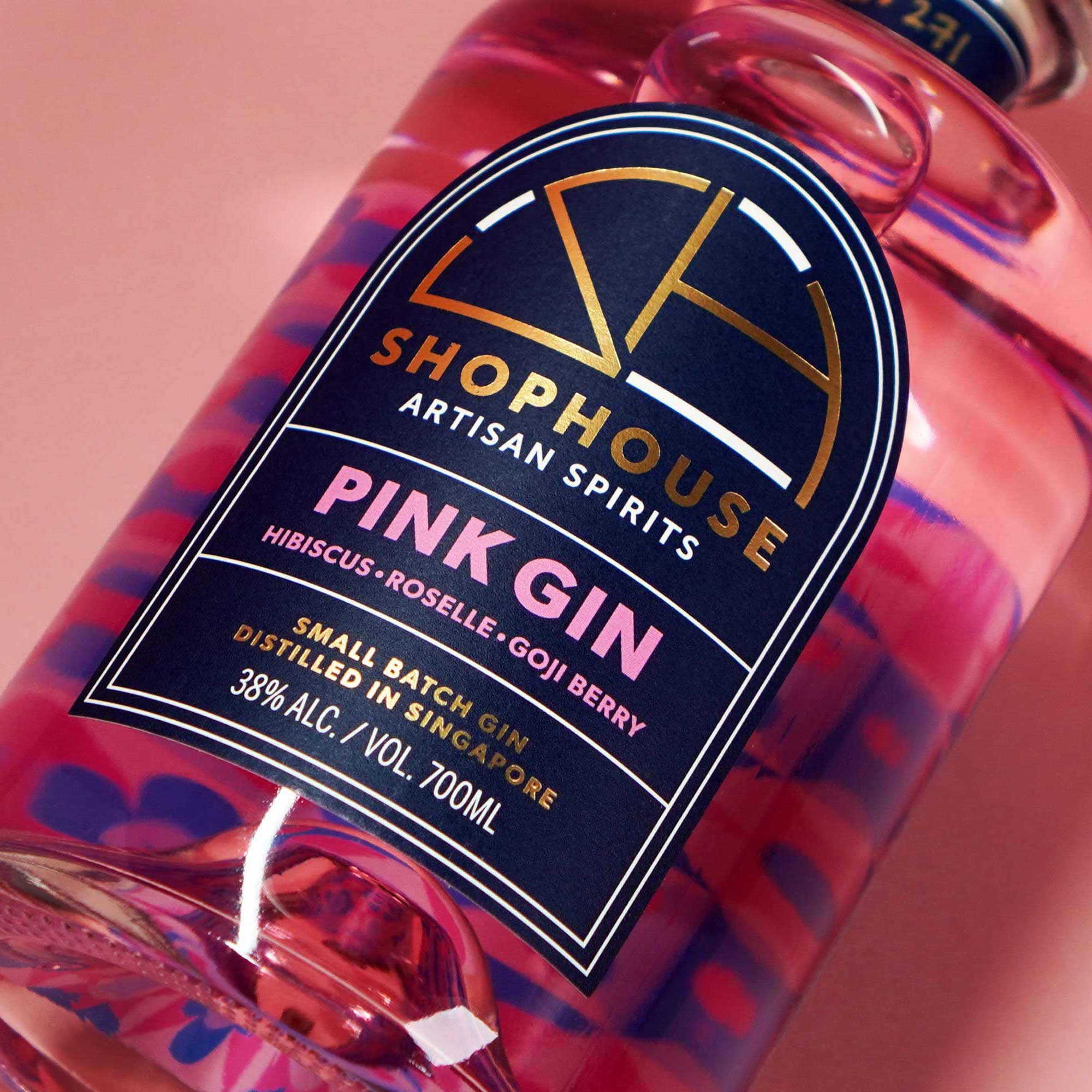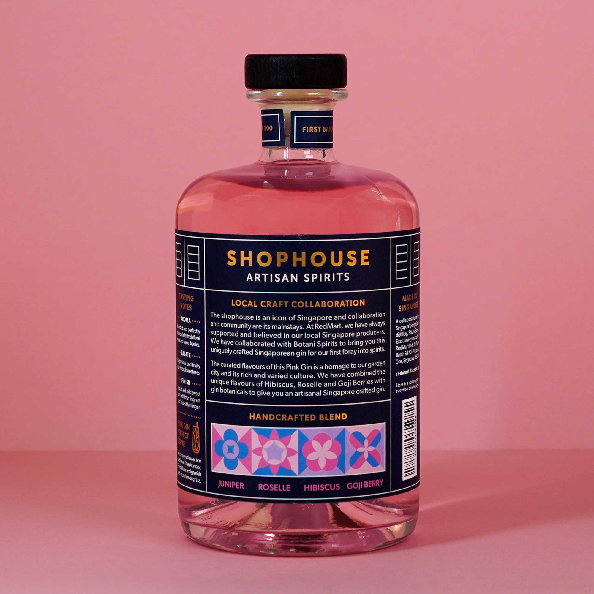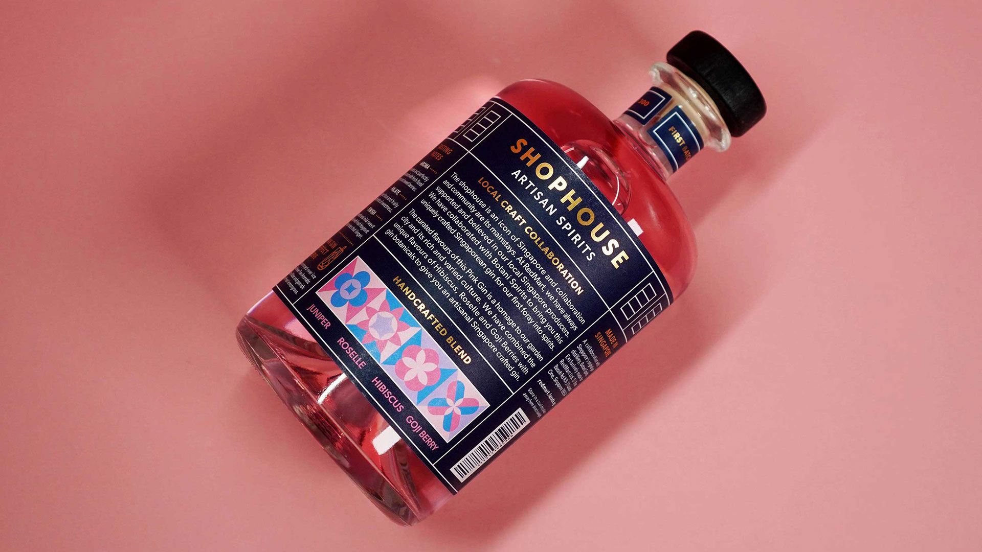 The design was inspired by the iconic visual cues commonly seen in Singapore's shophouses as an abstract interpretation of the bottle. Starting with the die-cut and the brand identity on the front label, we wanted to emulate the shape of the shophouse’s window frame. Within the bottle's inner label, we crafted a pattern with graphics that symbolises each key ingredient that makes Shophouse Pink Gin so unique. The Pink Gin Perfect Serve was created to indicate to people which mixer and garish is best for the Shophouse Gin. "Best enjoyed over ice with Fever-Tree Aromatic Tonic Water and garnish with fresh lemongrass.
