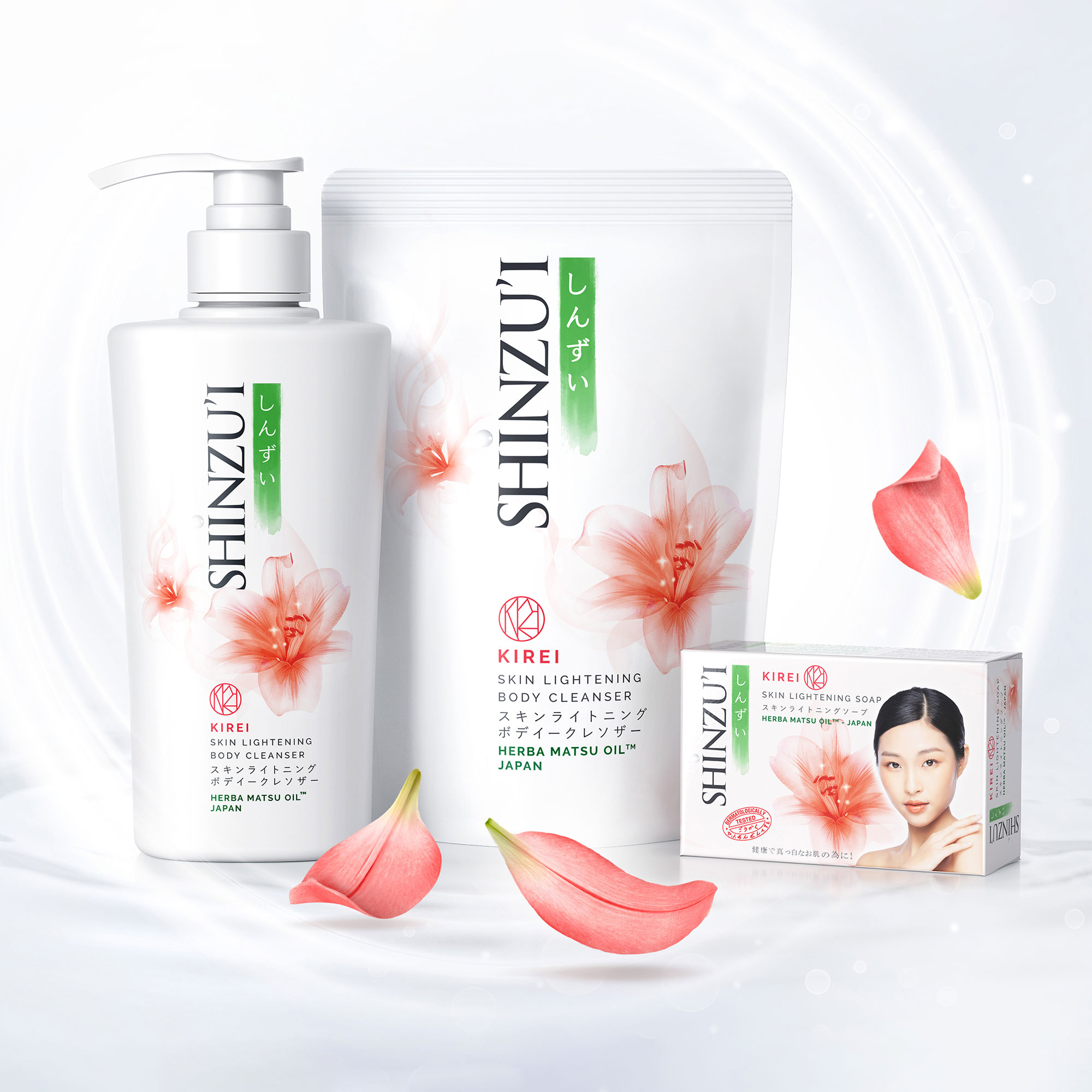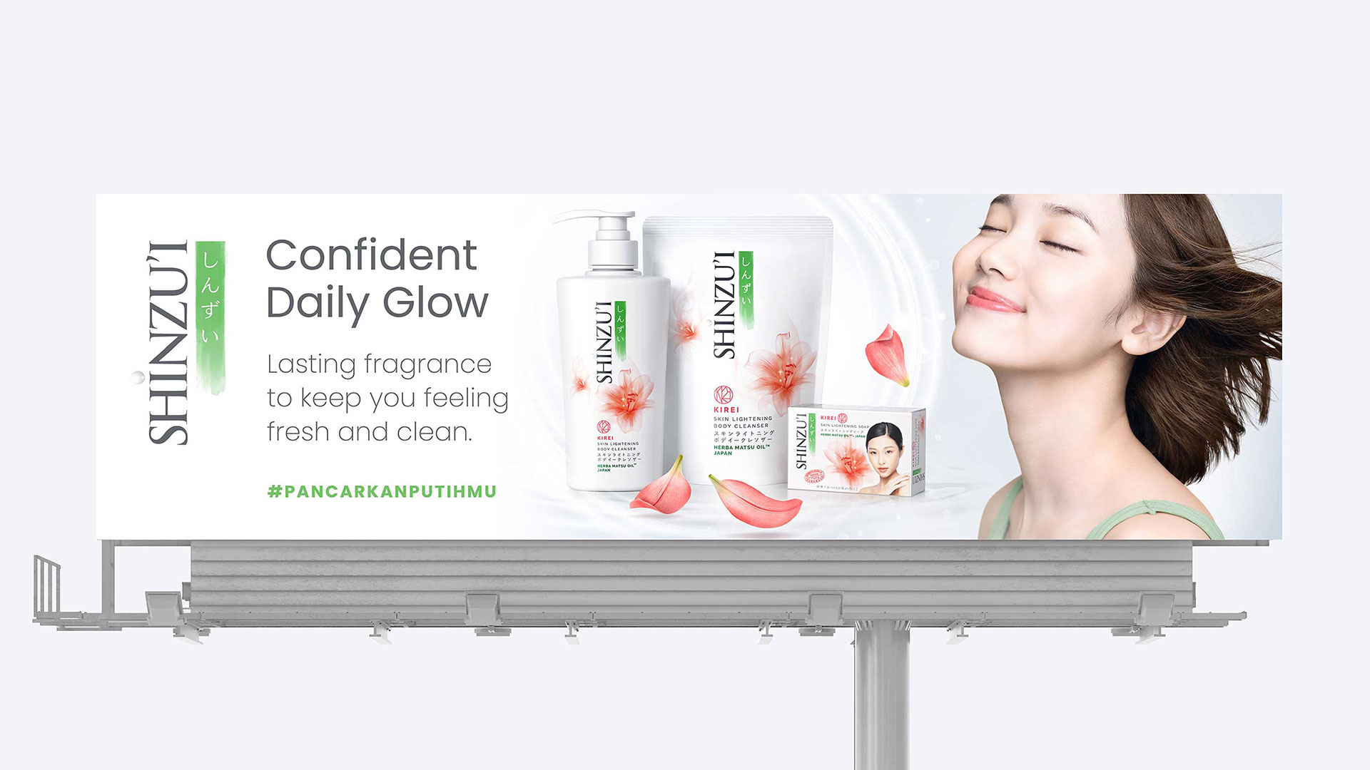 To refresh the brand communication for Shinzu'i, a personal care brand in Indonesia, we designed the core key visual to amplify the brand's offering of daily glow and confidence. The bright tones and graphics represent radiance and all-day freshness, while soft floating flower petals suggest the sensorial signature fragrance each Shinzu'i variant offers. In addition to the overall communication design, we produced the packaging design visuals to be used across different brand applications.