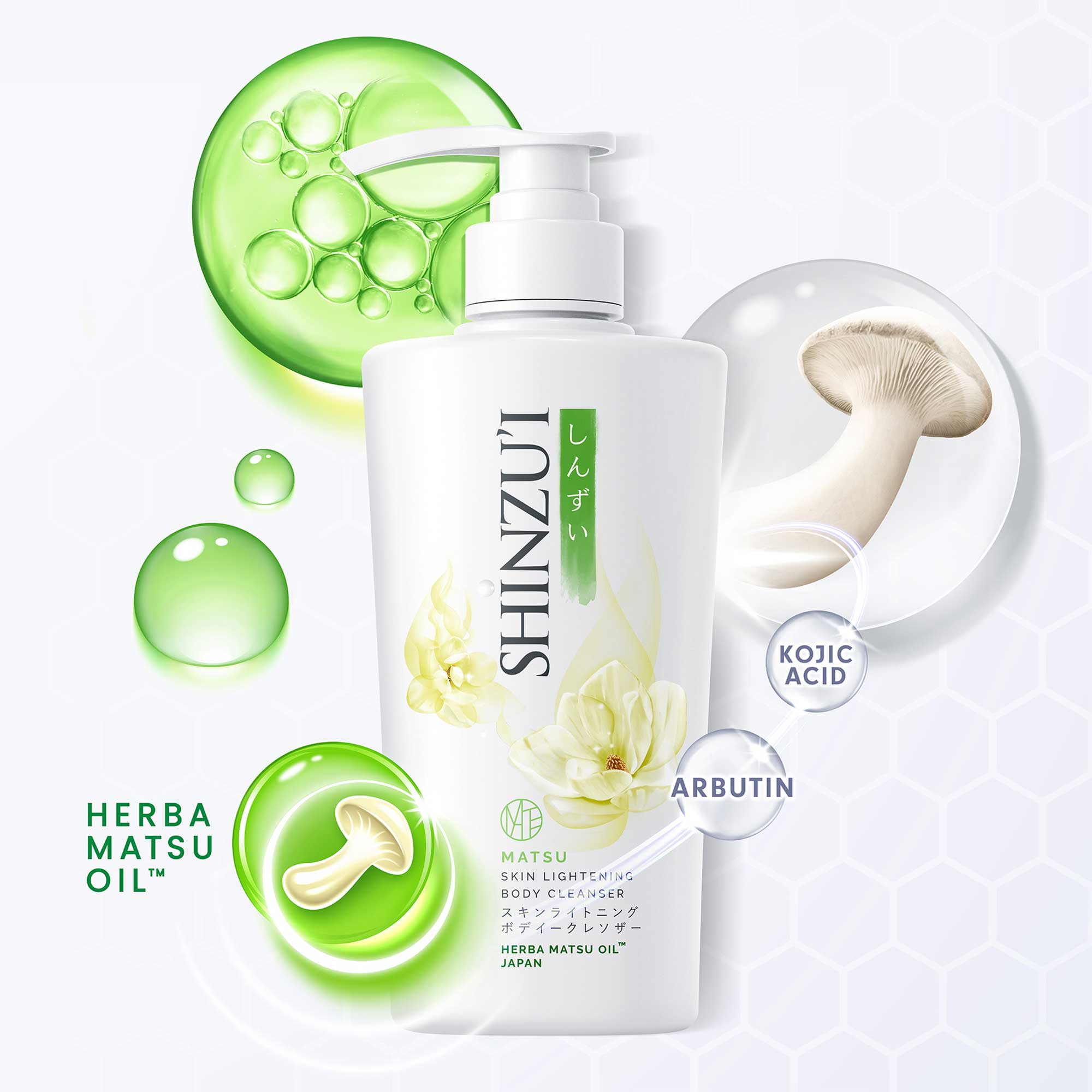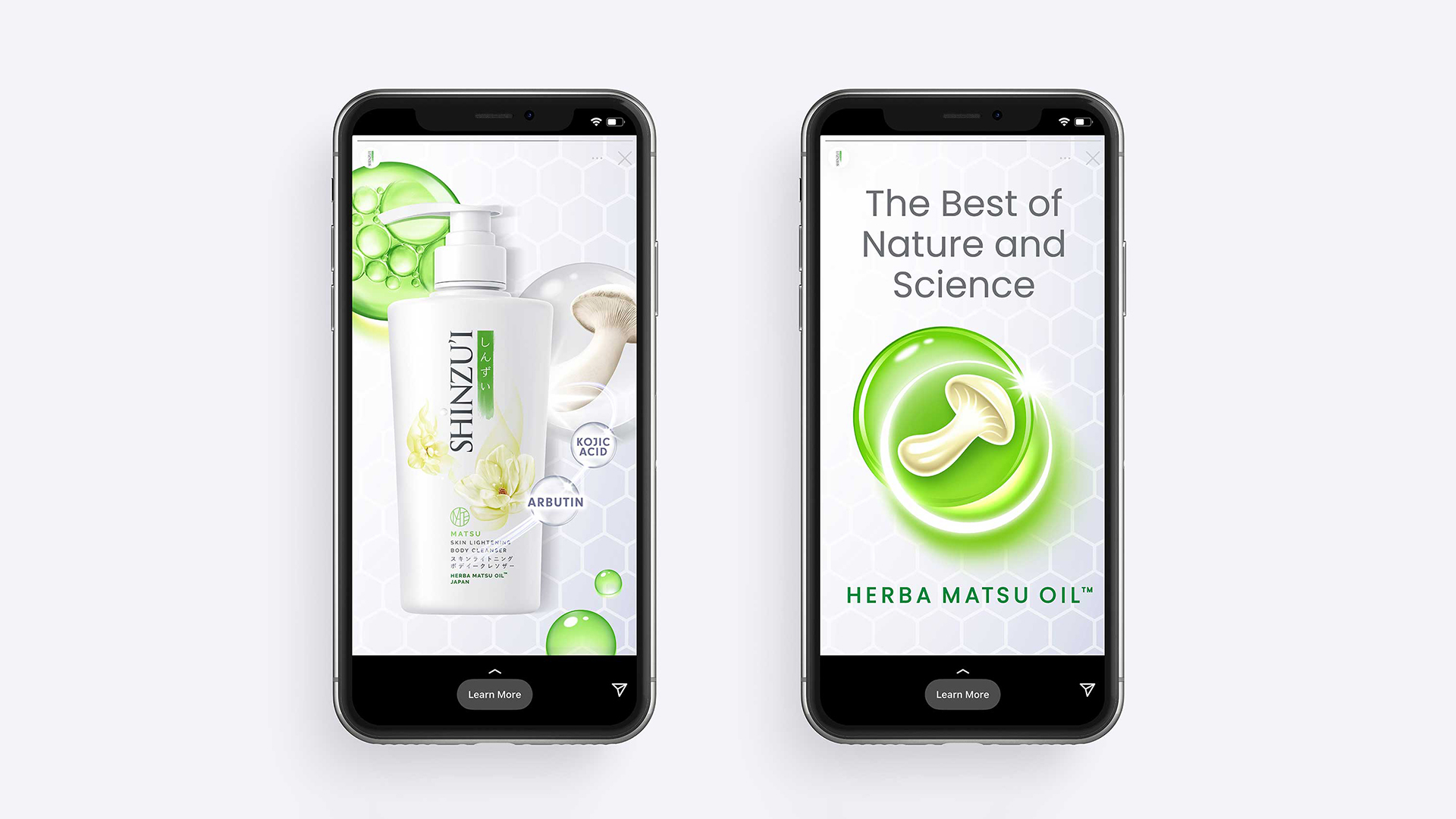 The Herba Matsu Oil brand icon needed an uplift. As part of the overall brief, we created an icon that clearly communicates the precious key ingredient, Matsutake Mushroom, known for its unique transformative properties and capturing the essence of what Herba Matsu Oil has to offer. We also created visual communication focusing on the benefit of Herba Matsu Oil, a proprietary ingredient that Shinzu'i pioneers within their product range.